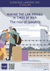 Following the invasion of Ukraine by Russia at the beginning of the year and its considerable impact on the populations concerned, but also more widely on Europe and the rest of the world, the theme selected for European Lawyers Day 2022 is “Making the law prevail in times of war: the role of lawyers”. This theme highlights the important role lawyers and Bars and Law Societies can play in such a context of war. It is an opportunity to shed light on the various initiatives taken by Bars and Law Societies, as well as lawyers and law firms, in reaction to humanitarian crises resulting from conflicts. It is important to recognise how lawyers safeguard individual human rights and how they represent victims of war in war crimes and crimes against humanity. Lawyers play an important role in the context of war by assisting people fleeing conflict and in search of safe haven. By being present at the borders or opening up contact points providing legal assistance to refugees, lawyers contribute to defending the right to asylum guaranteed by instruments such as the EU Charter of Fundamental Rights (Article 18) or the Geneva Convention 1951. Other aspects can also be highlighted, such as the importance of family law during war situations while families are torn apart, and vulnerable adults and minors being at a heightened risk of harm, abuse, and trafficking. The role of lawyers in relation to sanctions imposed by governments in the context of war can also be underlined, both in terms of evaluating the impact of sanctions on legal services, and in relation to lawyers’ role in advising clients regarding how to comply with measures and sanctions.