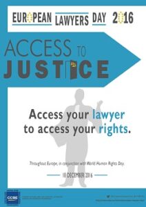 For the 2016 edition of European Lawyers Day, the CCBE proposes the central theme of “Access to Justice”. Access to Justice is indeed a main concern of the legal profession, and is an essential part of its core mission. However, since one European voice is preferred, we suggest to concentrate on the subtopic of “access your lawyer to access your rights”, with a focus on access to a lawyer in criminal proceedings, guaranteed across EU Member States through Directive 2013/48.